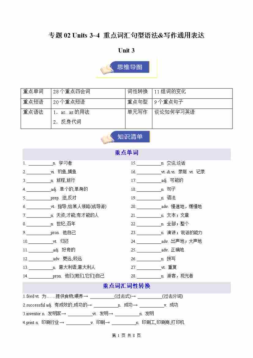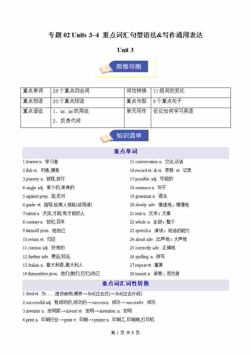 专题02 Units 3~4 重点词汇句型语法&写作通用表达(期末复习知识清单)(默写版)
