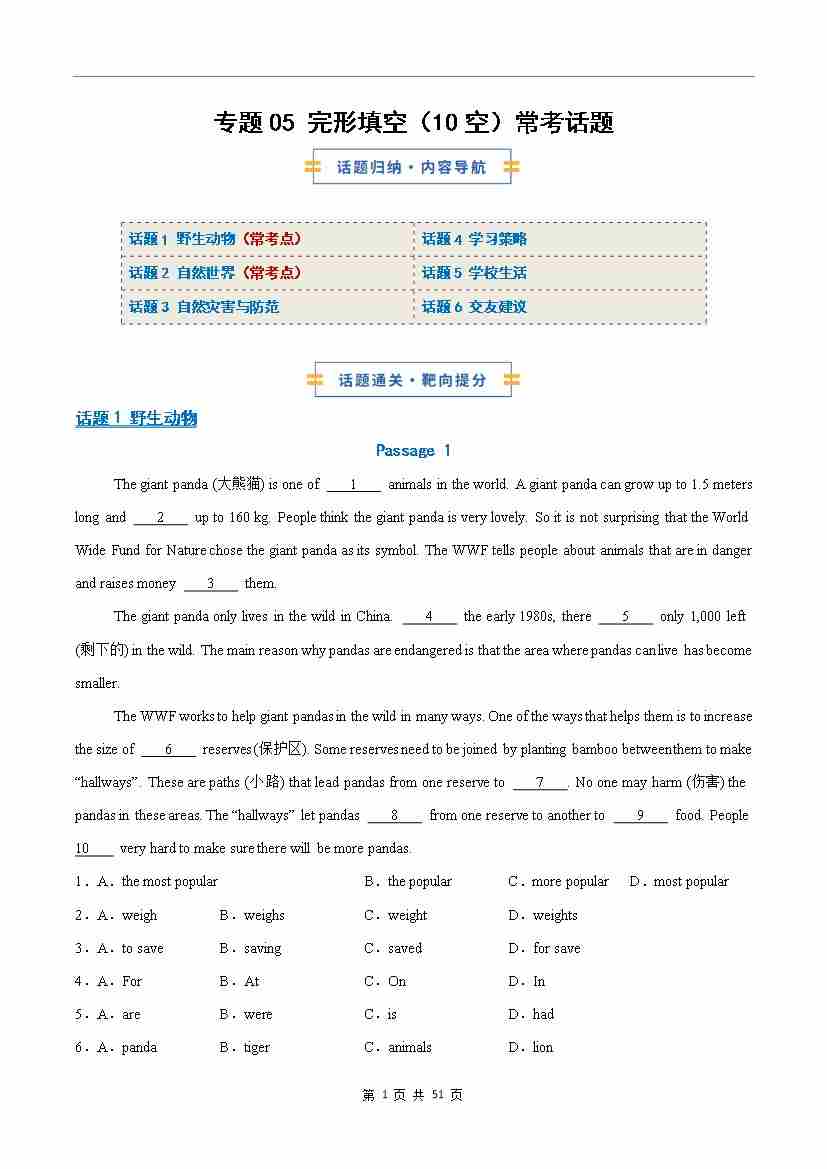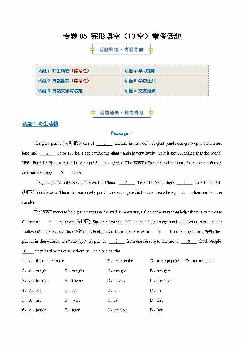 考前押题05完形填空(10题)常考话题(期末复习专项训练)(教师版)