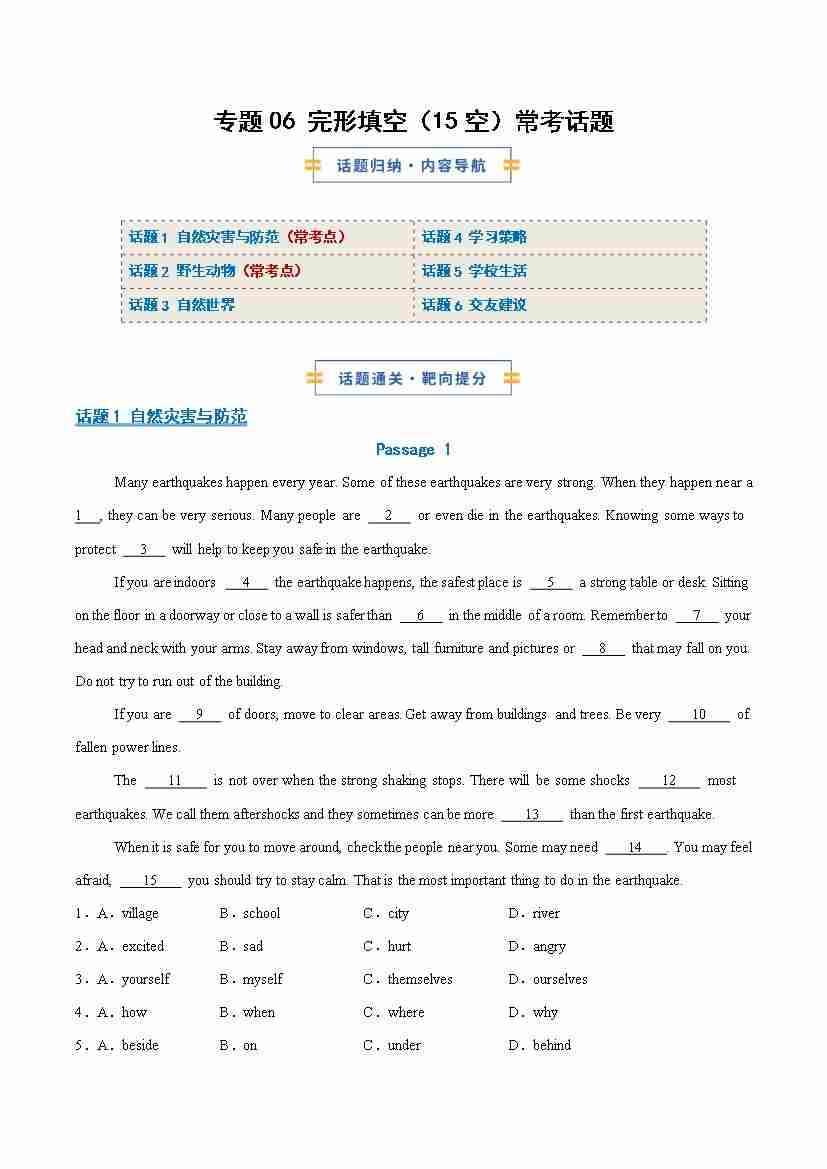 考前押题06 完形填空(15题)常考话题(期末复习专项训练)(学生版)