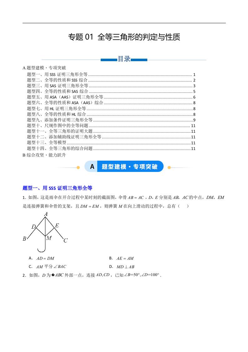 专题01 全等三角形的判定与性质(专项训练)(原卷版)