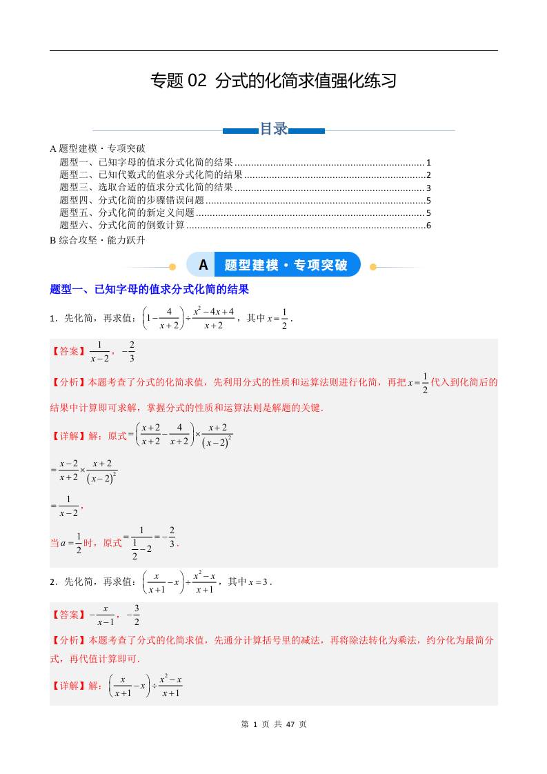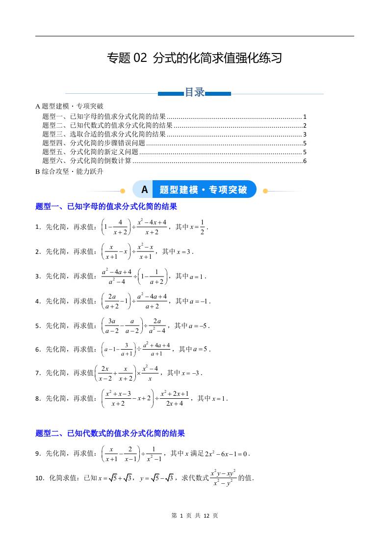 专题02 分式的化简求值强化练习(专项训练)(原卷版)数学冀教版2024八年级上册