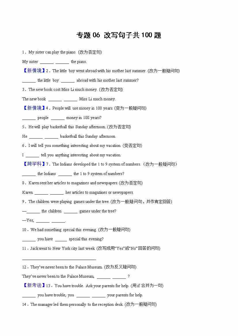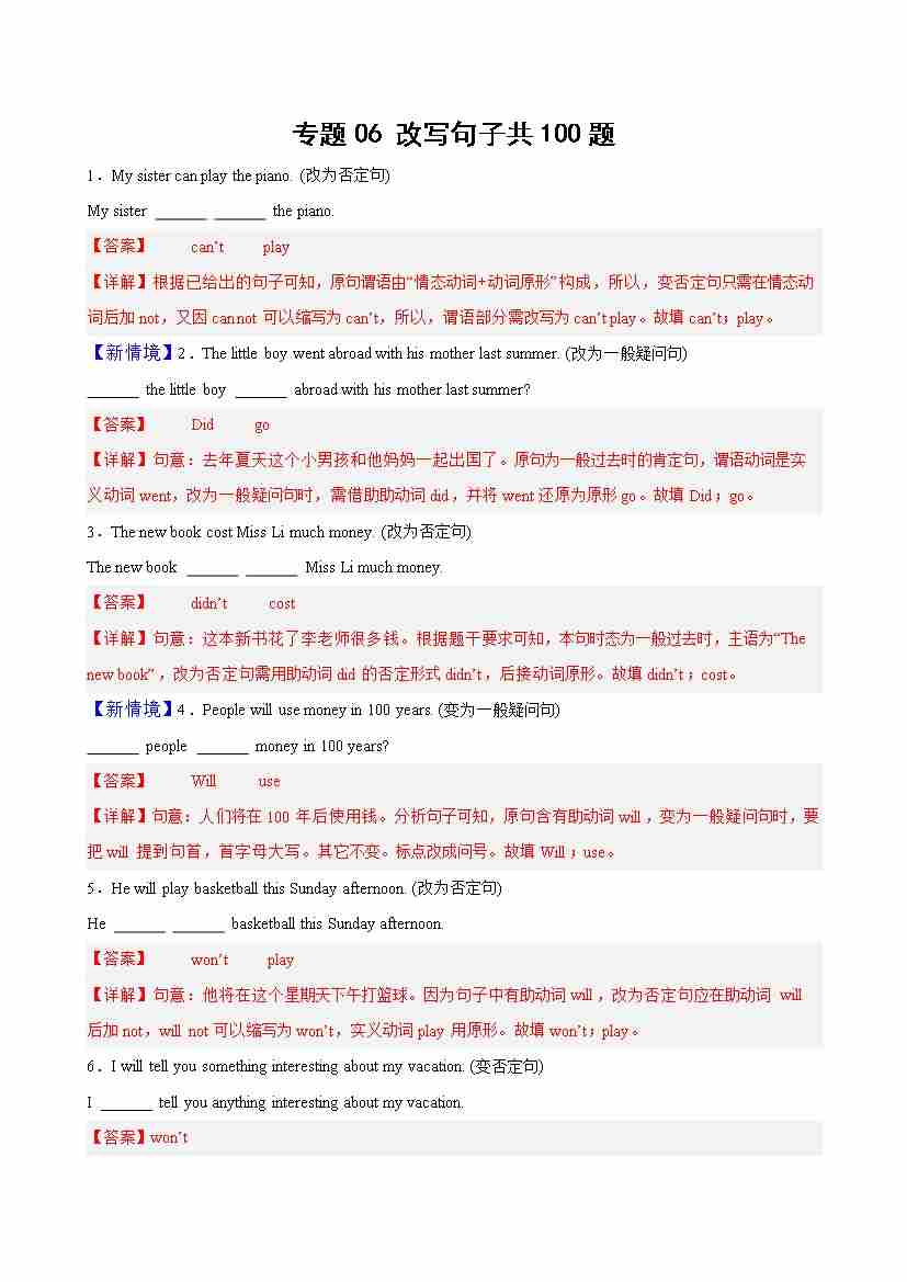 专题06 改写句子共100题(解析版)