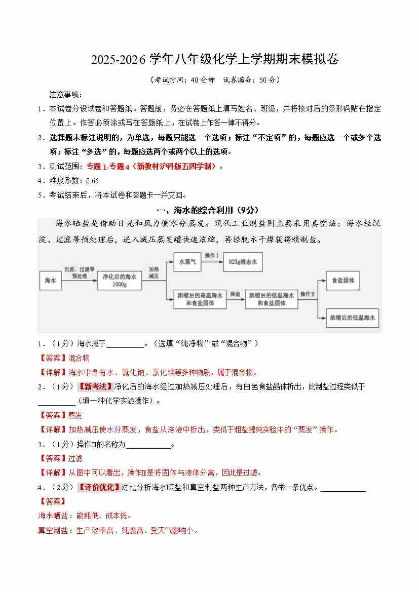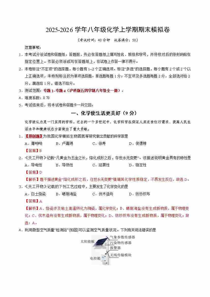 八年级化学上学期期末模拟卷(全解全析2)沪教54
