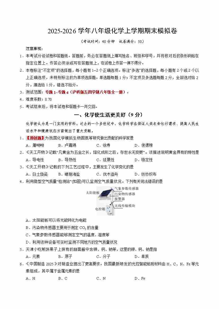 八年级化学期末模拟卷(测试范围:专题1~专题4)(新教材沪科版五四学制)(考试版A4)