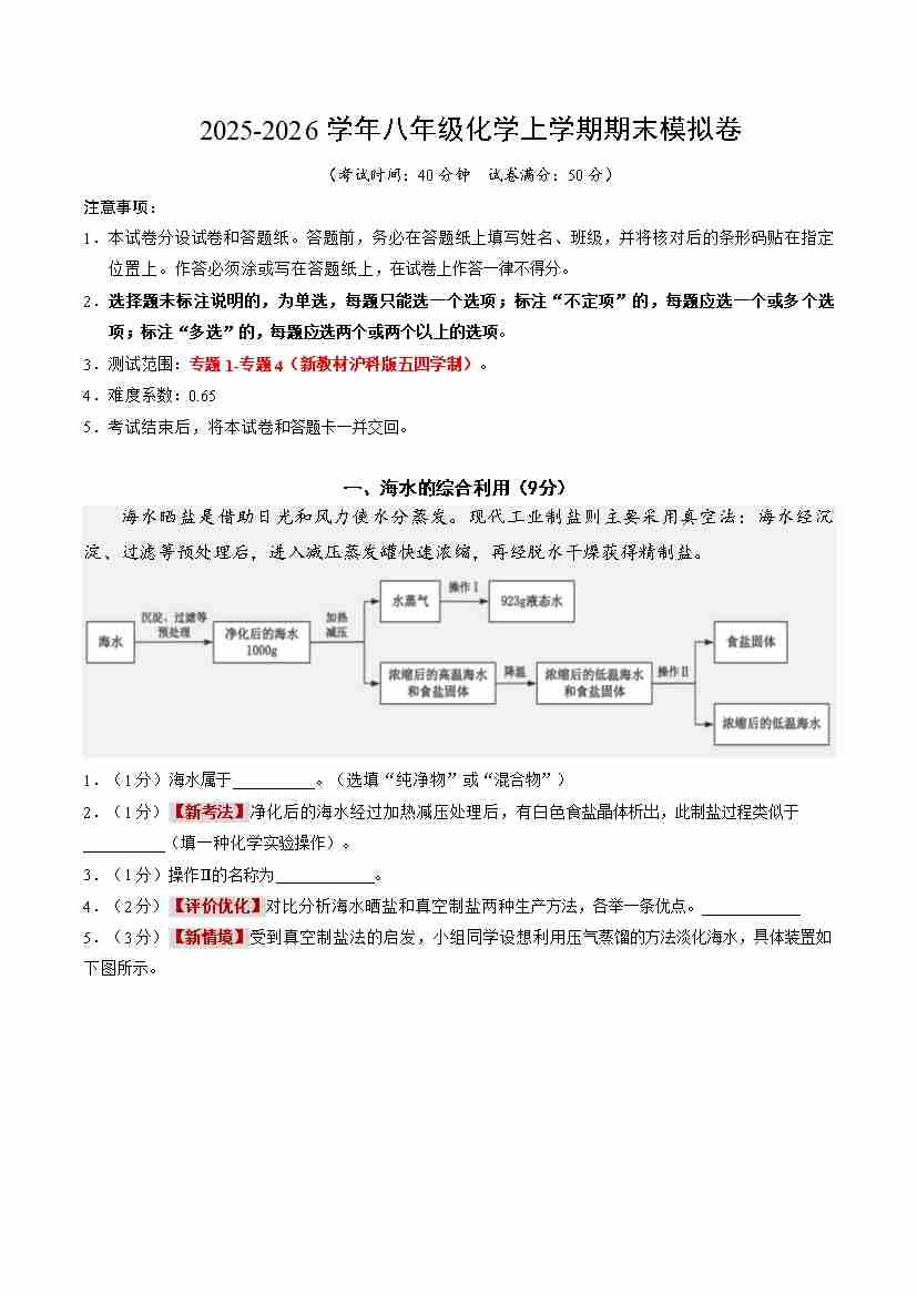 八年级化学上学期期末模拟卷(测试范围:专题1~专题4)(沪科版五四学制八年级全一册)(考试版2)A4版