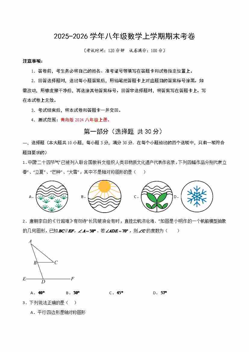 八年级上学期数学期末模拟卷【新教材青岛版,测试范围:上册全部内容】(考试版A4)
