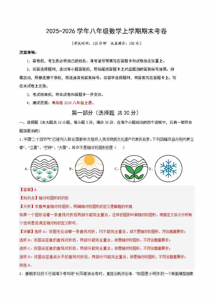 八年级上学期数学期末模拟卷【新教材青岛版,测试范围:上册全部内容】(解析版)