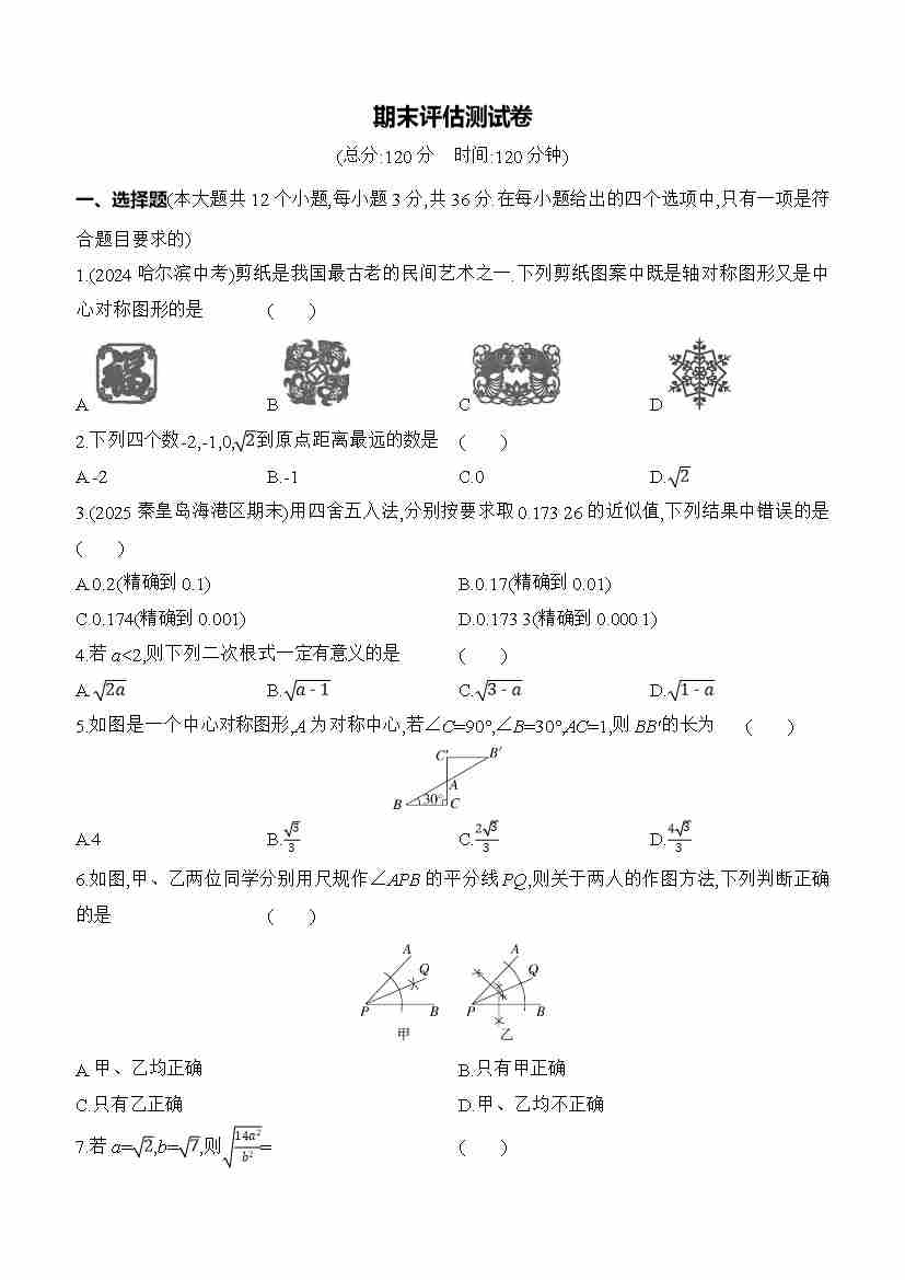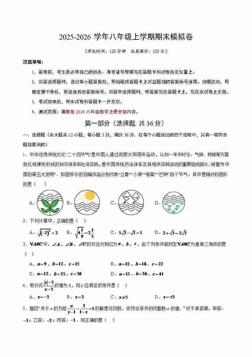 期末评估测试卷 (含答案) 2025-2026学年数学冀教版(2024)八年级上册