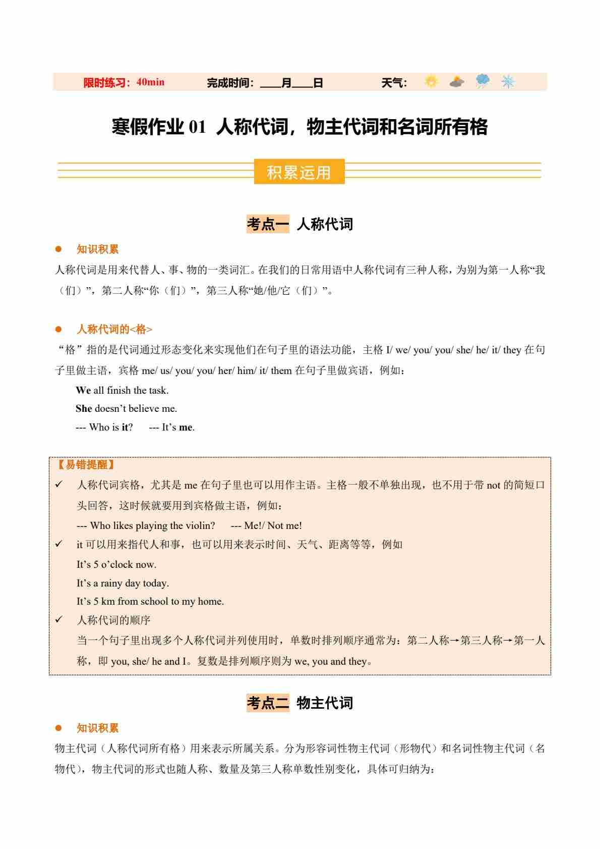 寒假作业01 人称代词,物主代词和名词所有格(巩固培优)(原卷版)