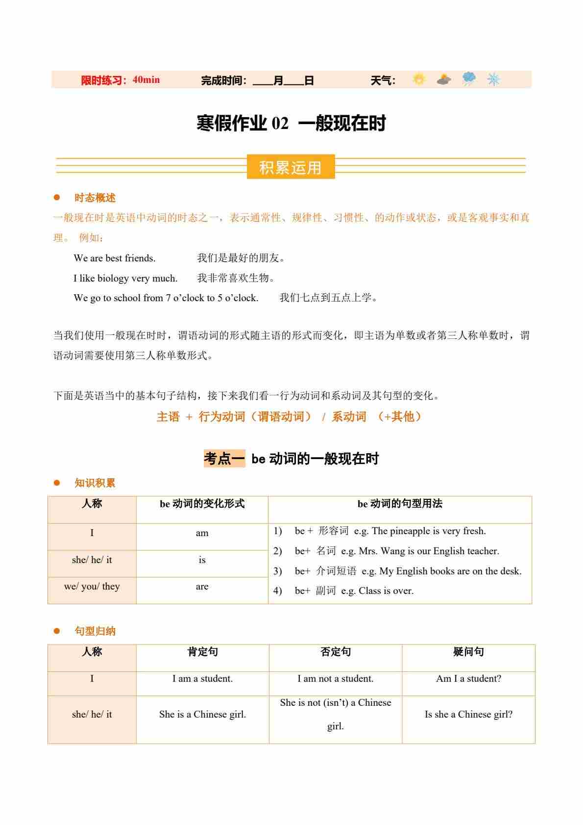 寒假作业02 一般现在时(巩固培优)(原卷版)