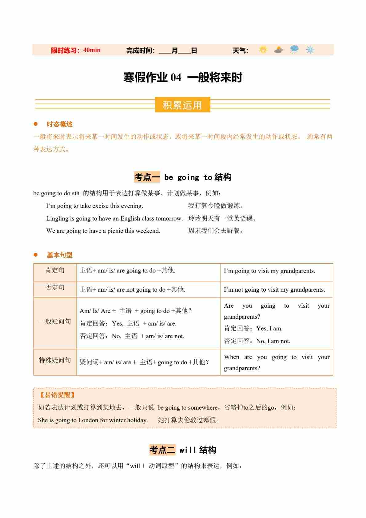 寒假作业04 一般将来时(巩固培优)(原卷版)