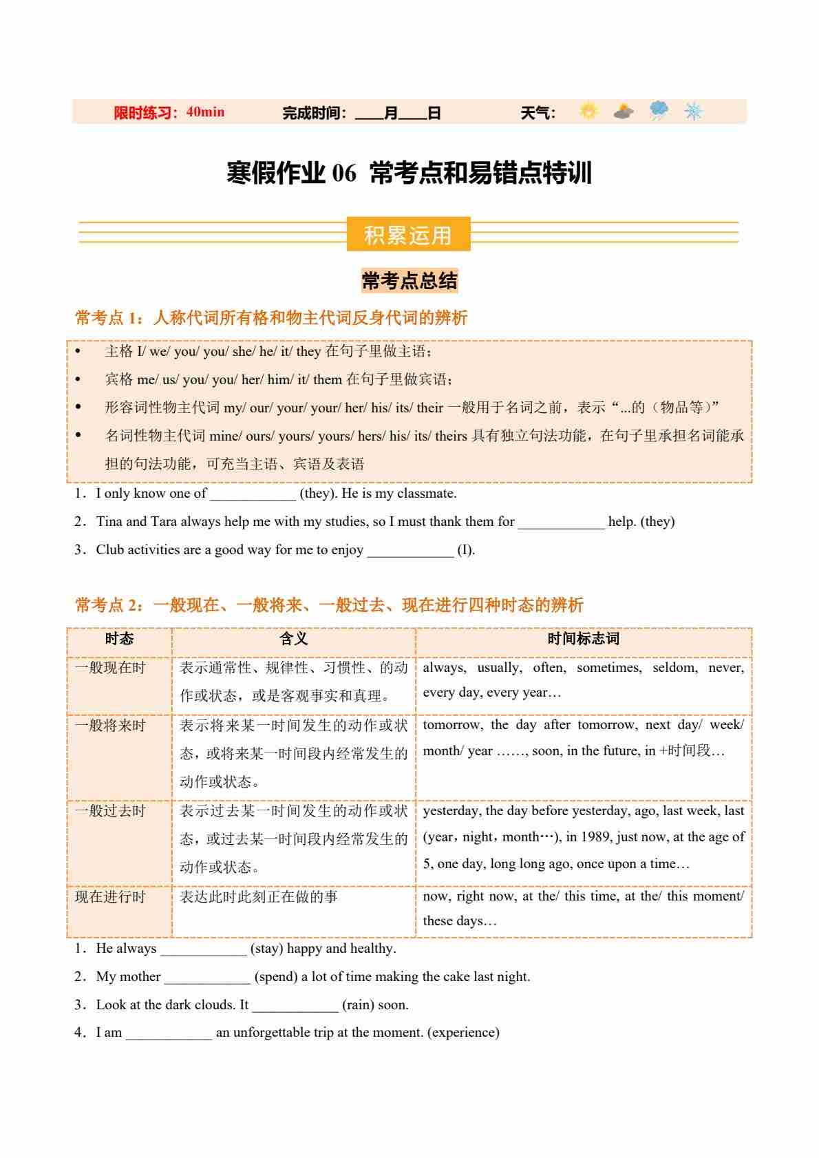 寒假作业06 常考点和易错点特训(巩固培优)(原卷版)