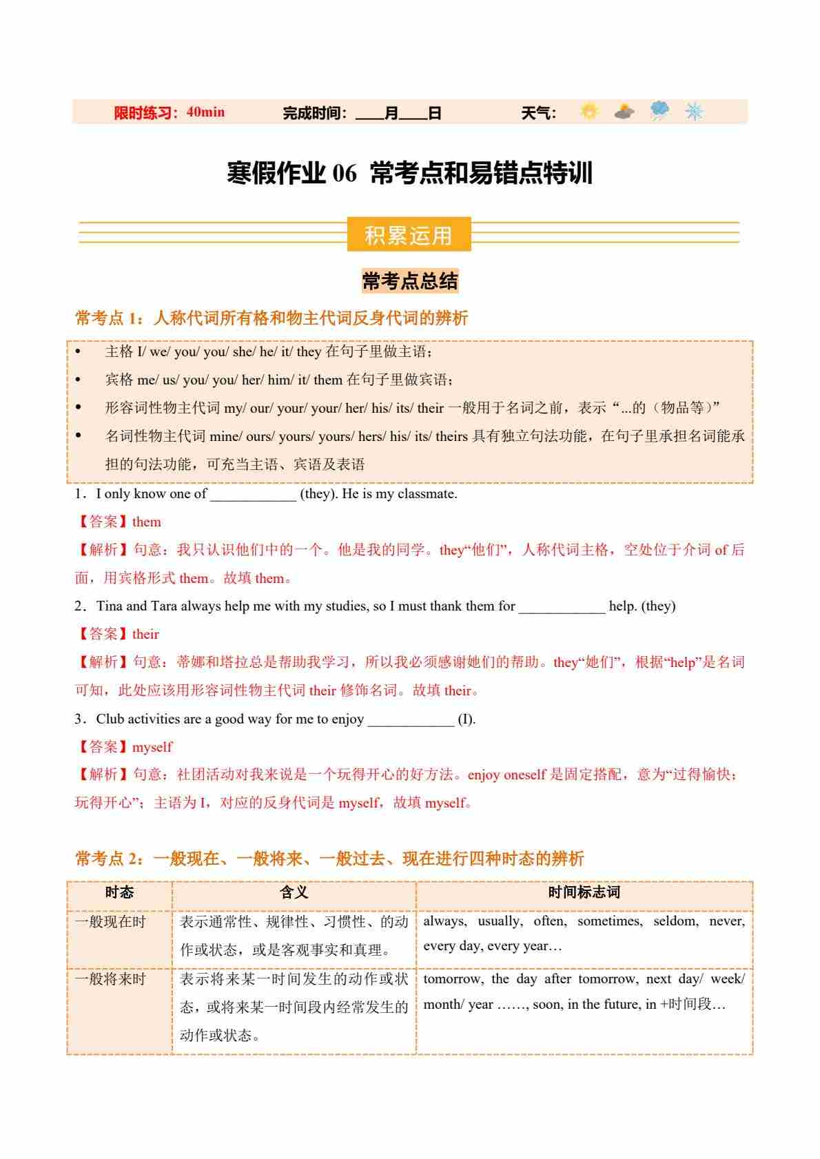 寒假作业06 常考点和易错点特训(巩固培优)(解析版)