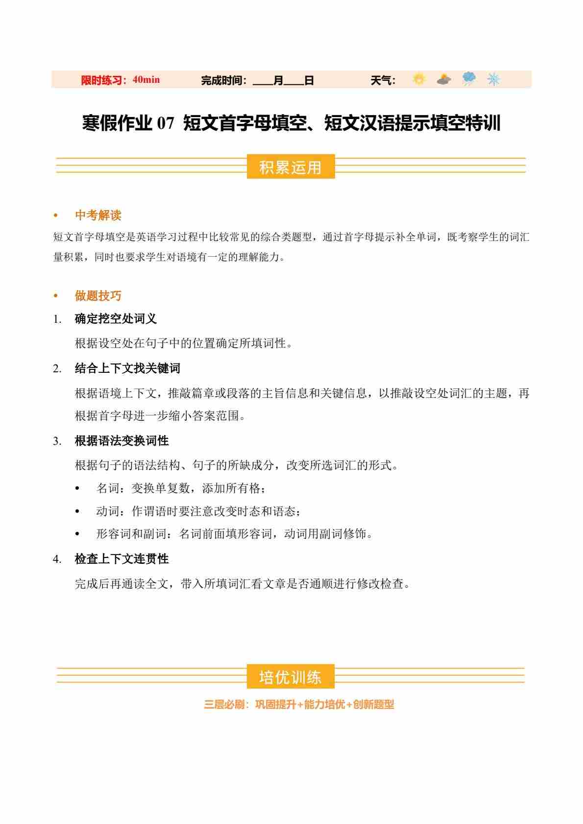 寒假作业07 短文首字母填空、短文汉语提示填空特训(巩固培优)(解析版)