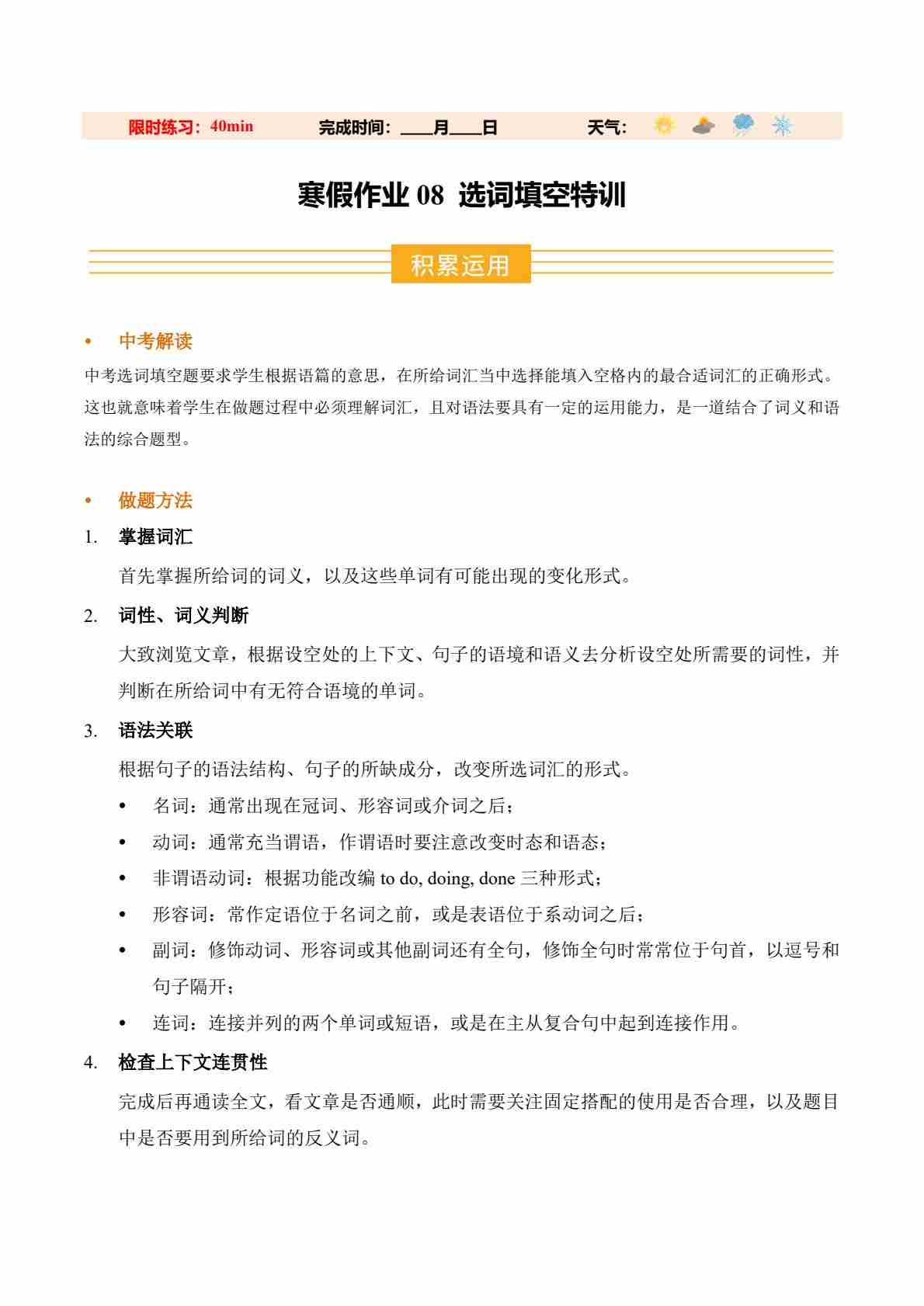 寒假作业08 选词填空特训(巩固培优)(原卷版)