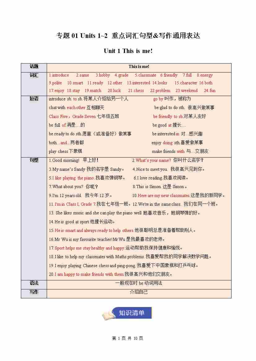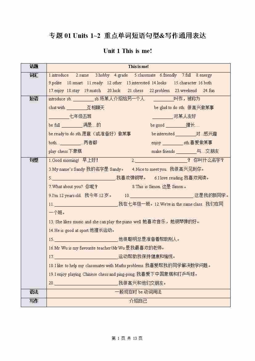 专题01 Units 1~2 重点词汇句型&写作通用表达(期末复习知识清单)(默写版)