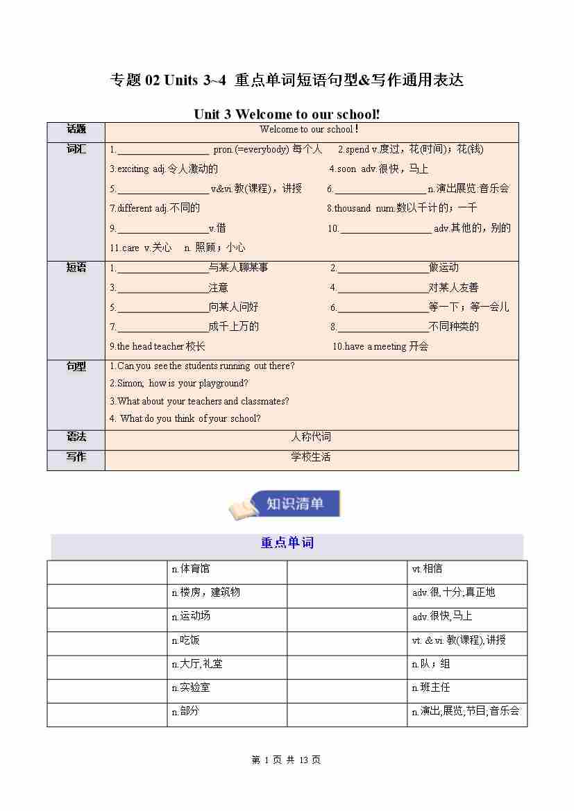 专题02 Units 3~4重点词汇句型&写作通用表达(期末复习知识清单)(默写版)