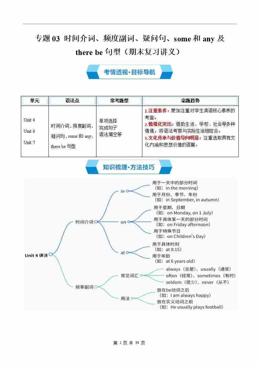 专题03 时间介词、频度副词、some和any、there be句型及疑问句(期末复习讲义)(解析版)