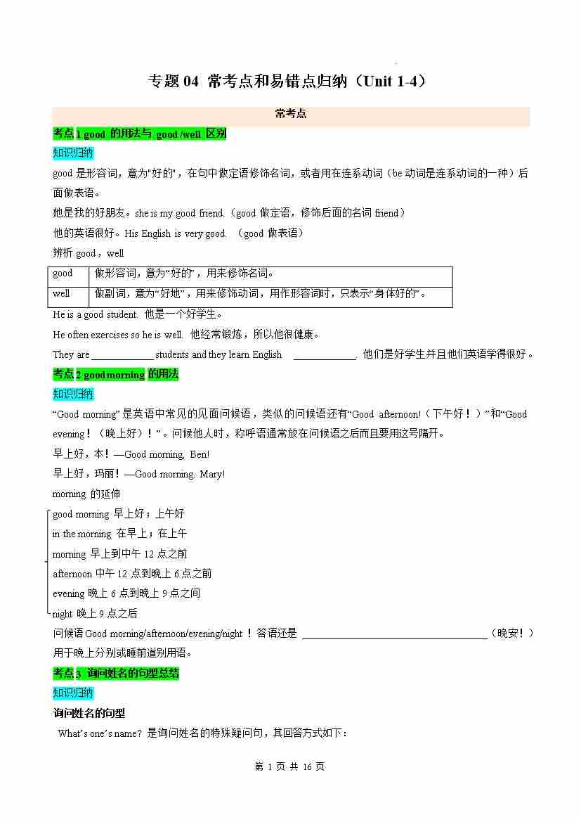 专题04 常考点和易错点归纳(Unit 1-4)(期末复习讲义)(原卷版)