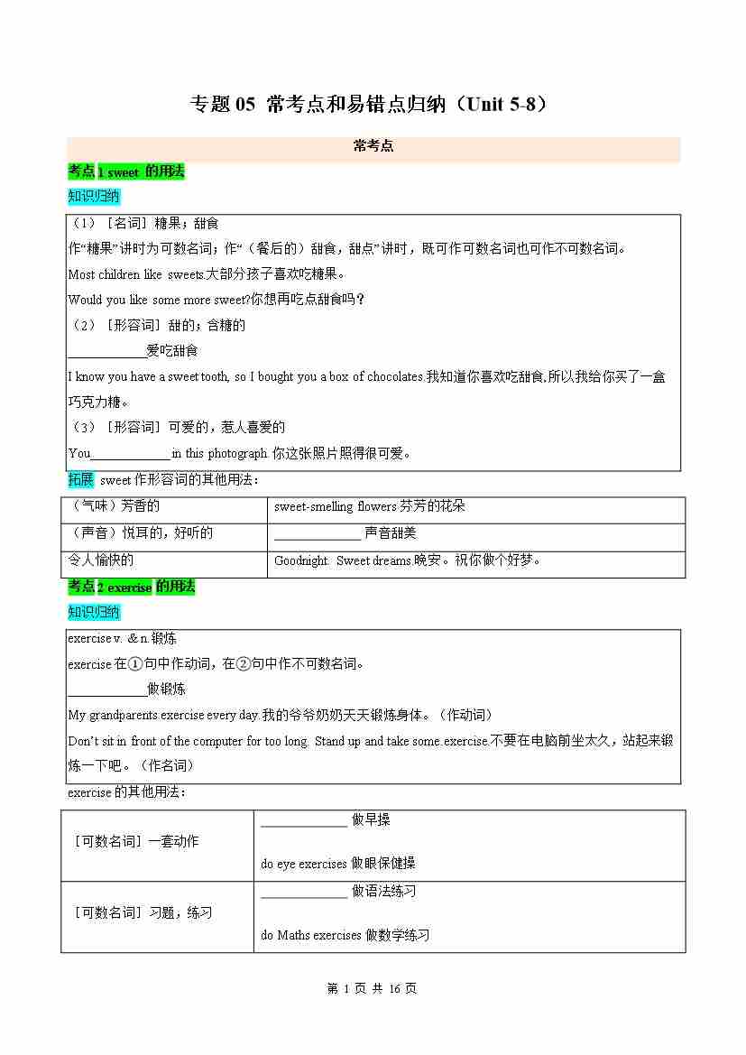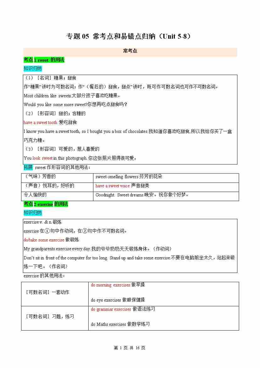 专题05常考点和易错点归纳(Unit 5-8)(期末复习讲义)(原卷版)