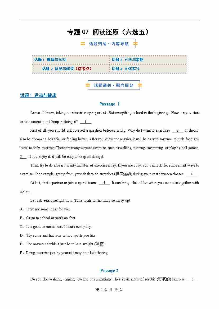 考前押题07 阅读还原(六选五)常考话题(期末复习专项训练)(原卷版)