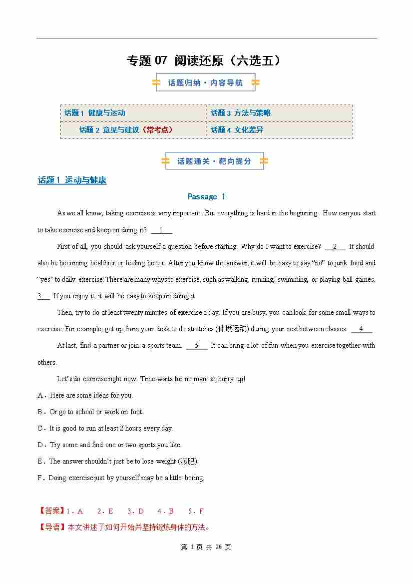 考前押题07 阅读还原(六选五)常考话题(期末复习专项训练)(解析版)