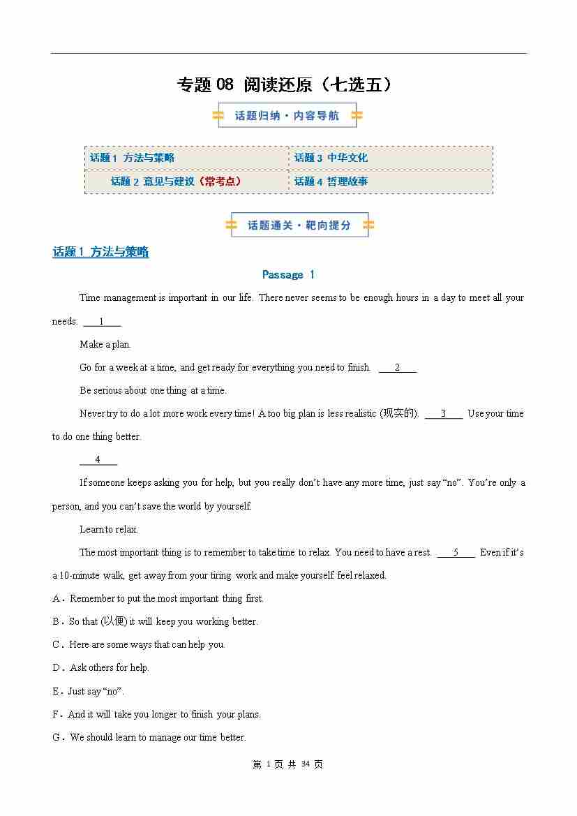 考前押题08 阅读还原(七选五)常考话题(期末复习专项训练)(解析版)