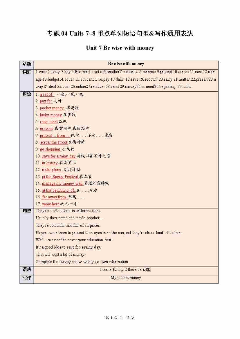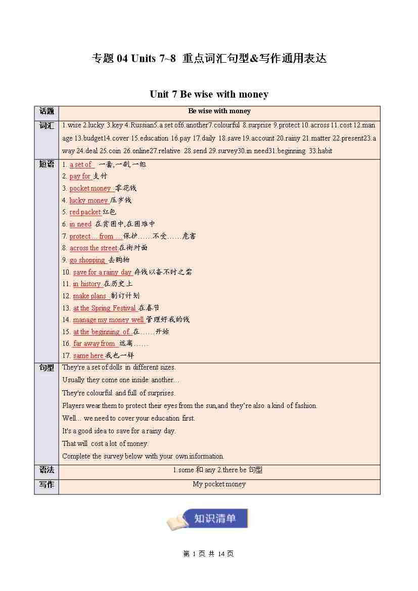 专题04 Units 7~8 重点词汇句型&写作通用表达(期末复习知识清单)(背诵版)