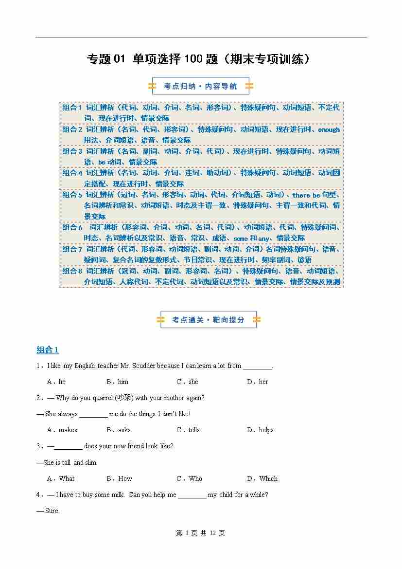 考前押题01单项选择100题(期末专项训练)(原卷版)