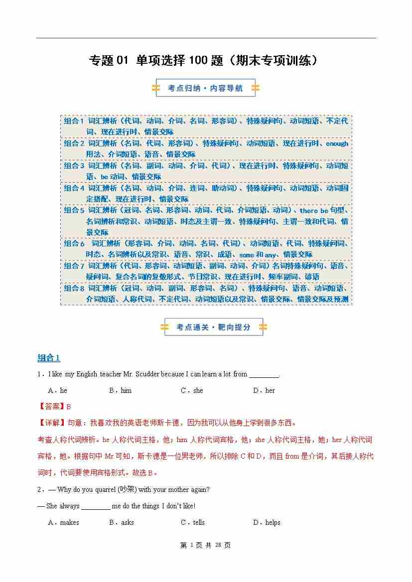 考前押题01单项选择100题(期末专项训练)(解析版)