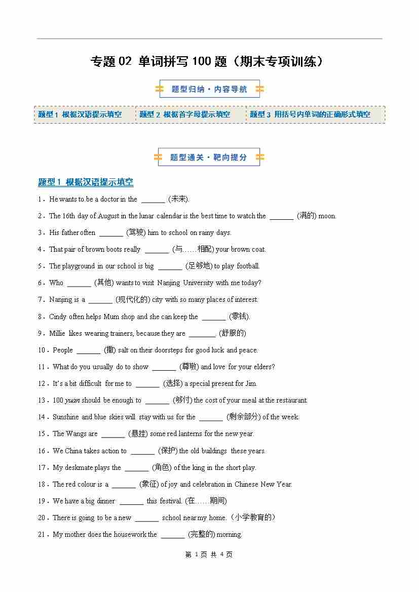 考前押题02 单词拼写100题(期末专项训练)(原卷版)