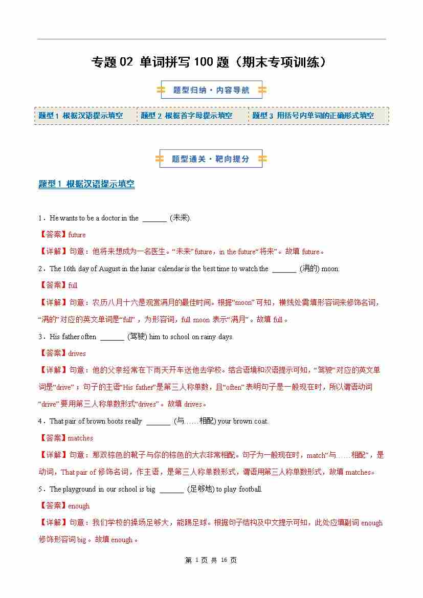考前押题02 单词拼写100题(期末专项训练)(解析版)