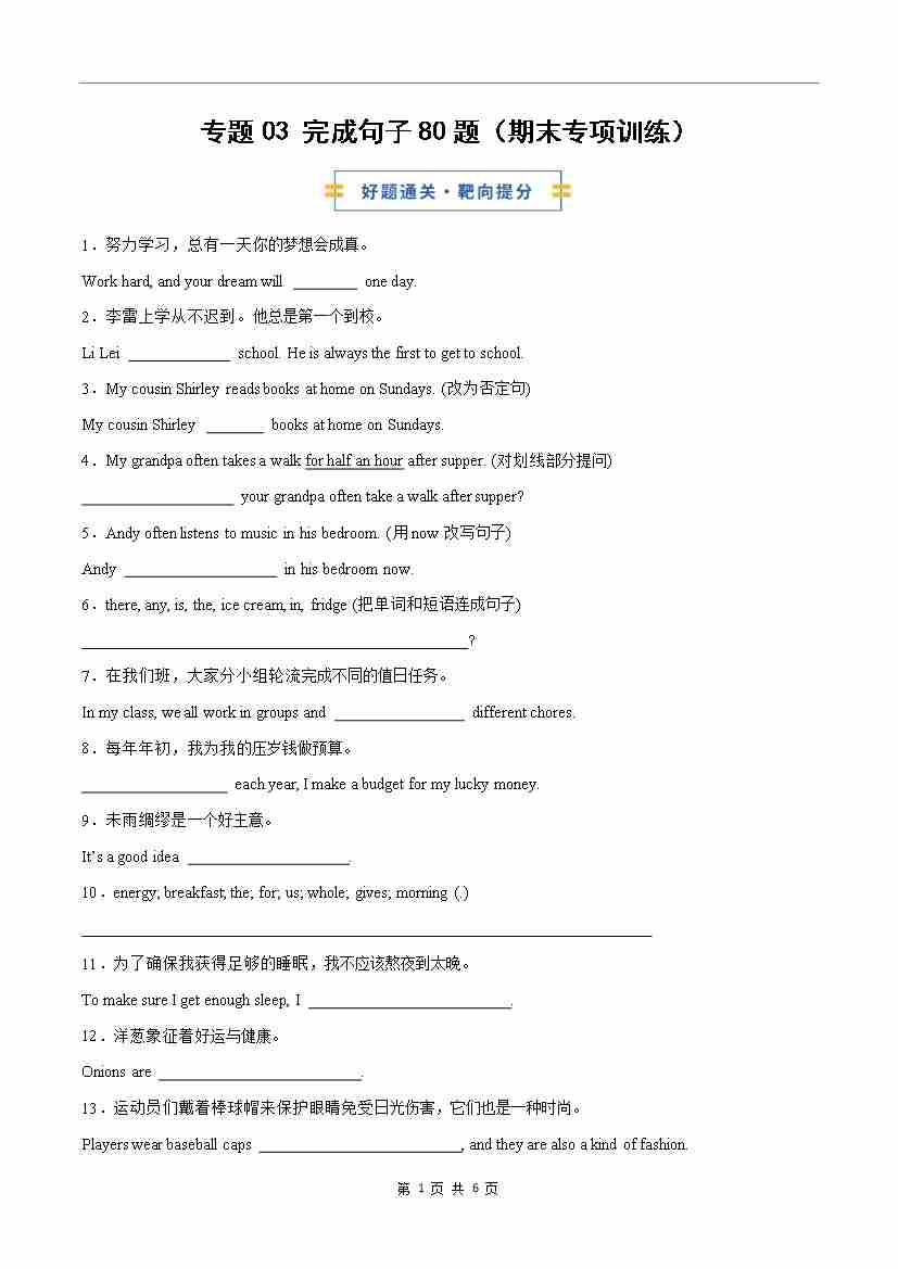 考前押题03 完成句子80题(期末专项训练)(原卷版)