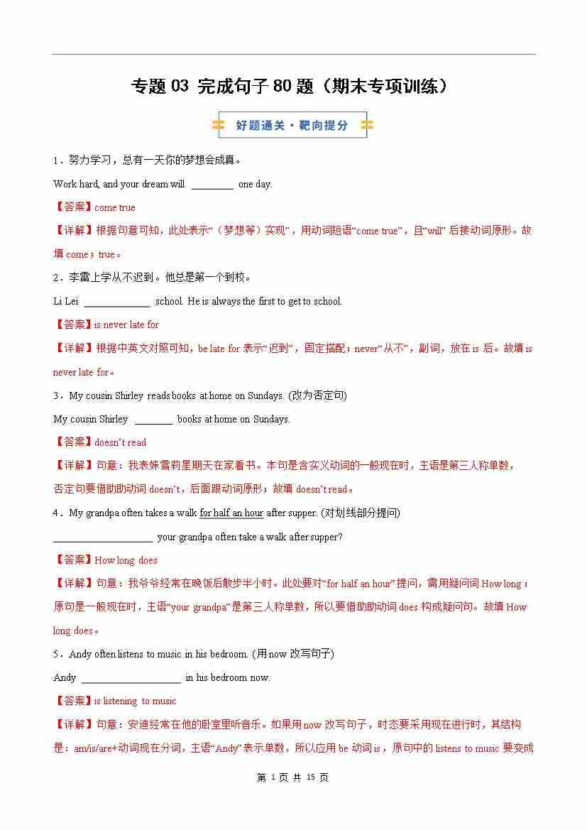 考前押题03 完成句子80题(期末专项训练)(解析版)