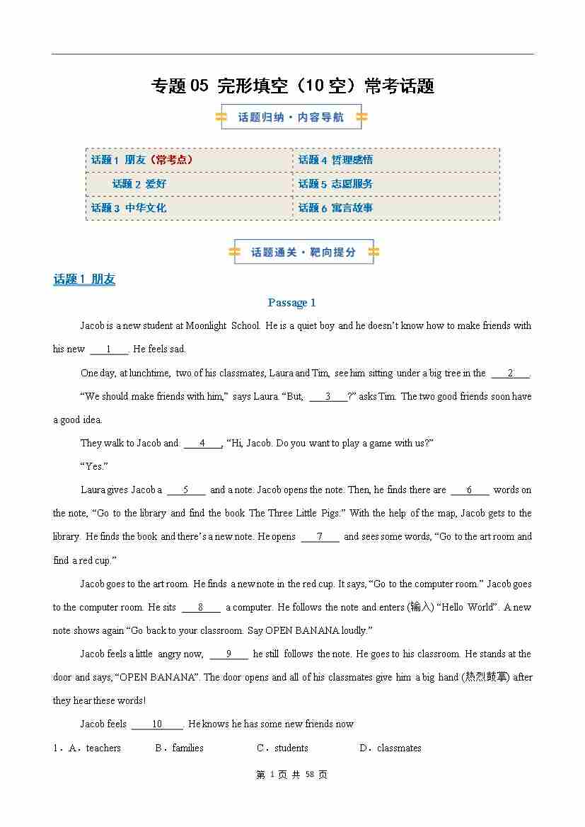 考前押题05 完形填空(10空)常考话题(期末复习专项训练)(解析版)