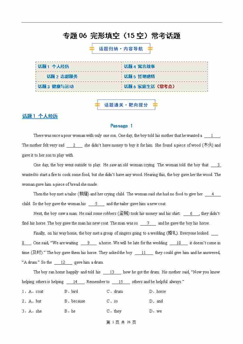 考前押题06 完形填空(15空)常考话题(期末复习专项训练)(原卷版)