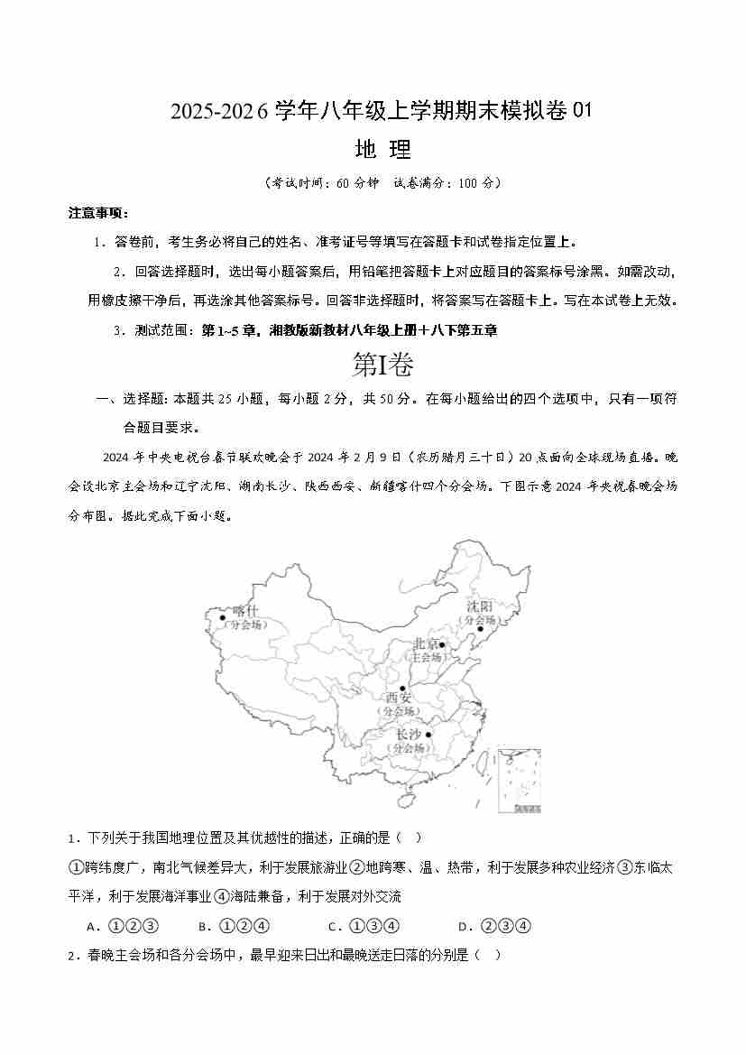 八年级地理上学期期末模拟卷01(新教材湘教版)(考试版)