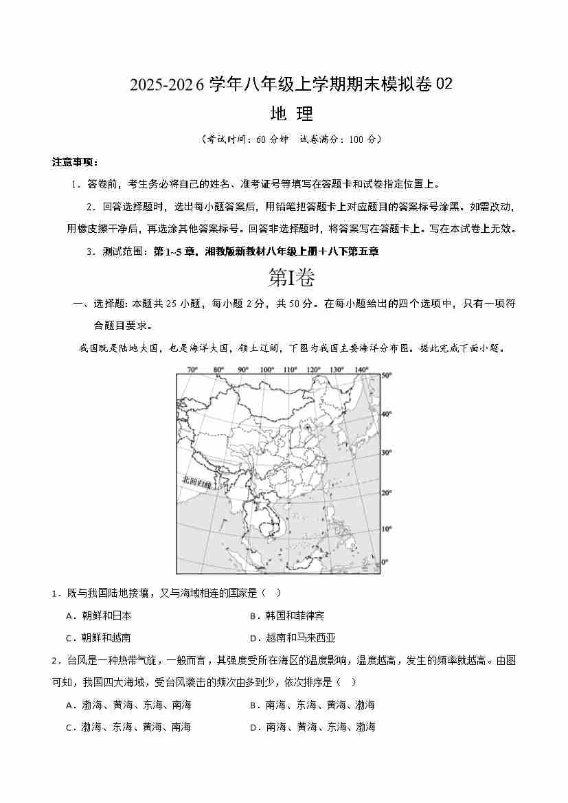 八年级地理上学期期末模拟卷02(新教材湘教版)(考试版)