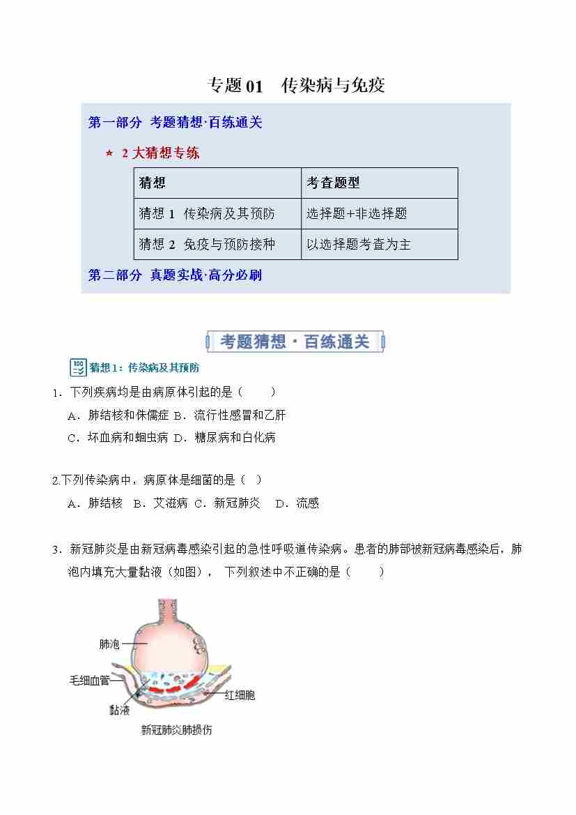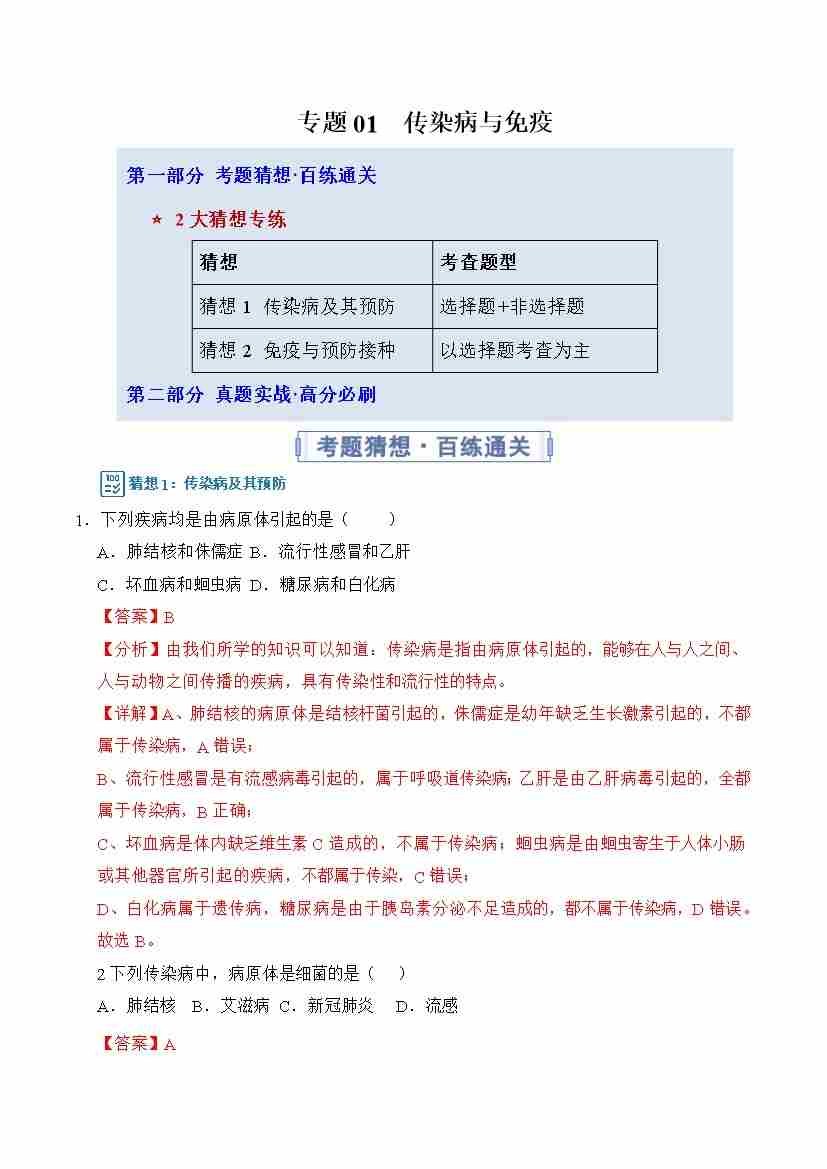 专题01 传染病与免疫(专项训练)(学生版)