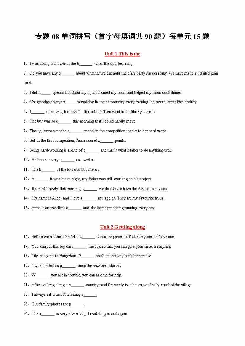专题08单词拼写(首字母填词共90题)(原卷版)