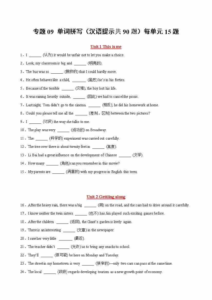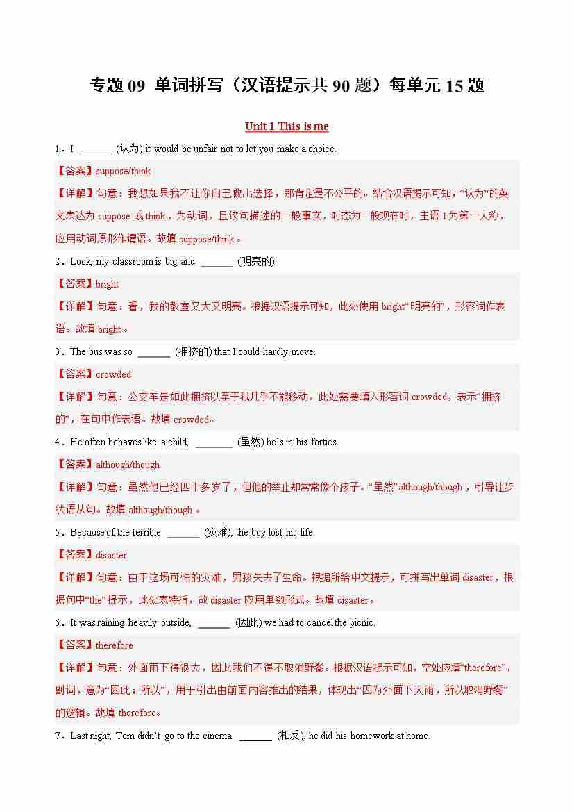专题09 单词拼写(汉语提示共90题)(解析版)