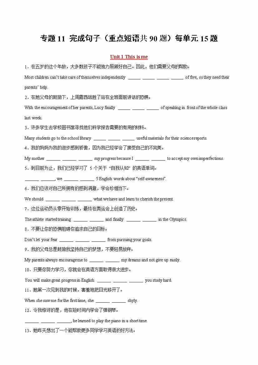 专题11 完成句子(重点短语共90题)(原卷版)
