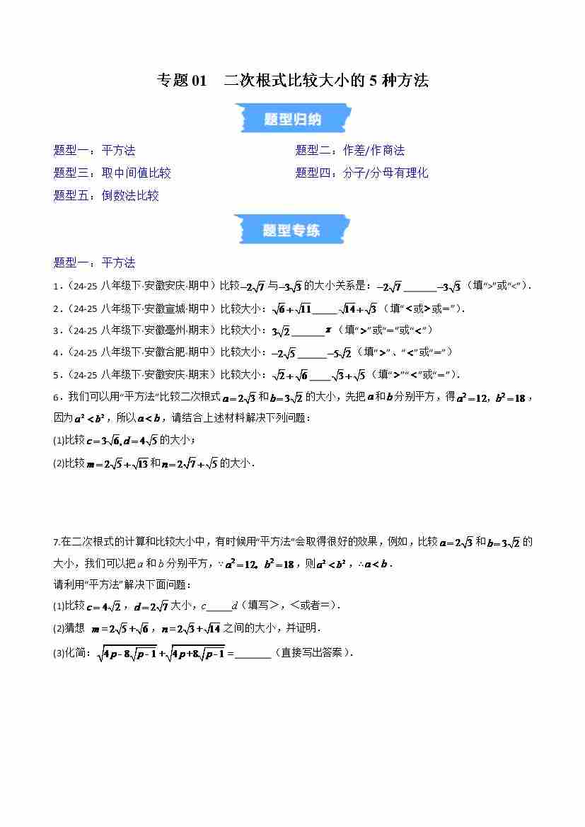 专题01 二次根式比较大小的5种方法(高效培优专项训练)(原卷版)