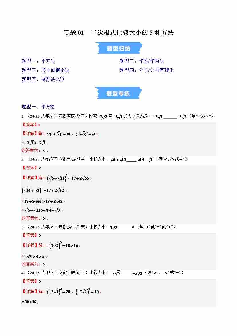 专题01 二次根式比较大小的5种方法(高效培优专项训练)(解析版)