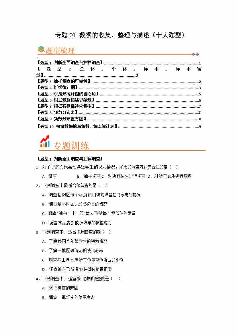 专题01 数据的收集、整理与描述(十大题型)(题型训练易错精练)(原卷版)