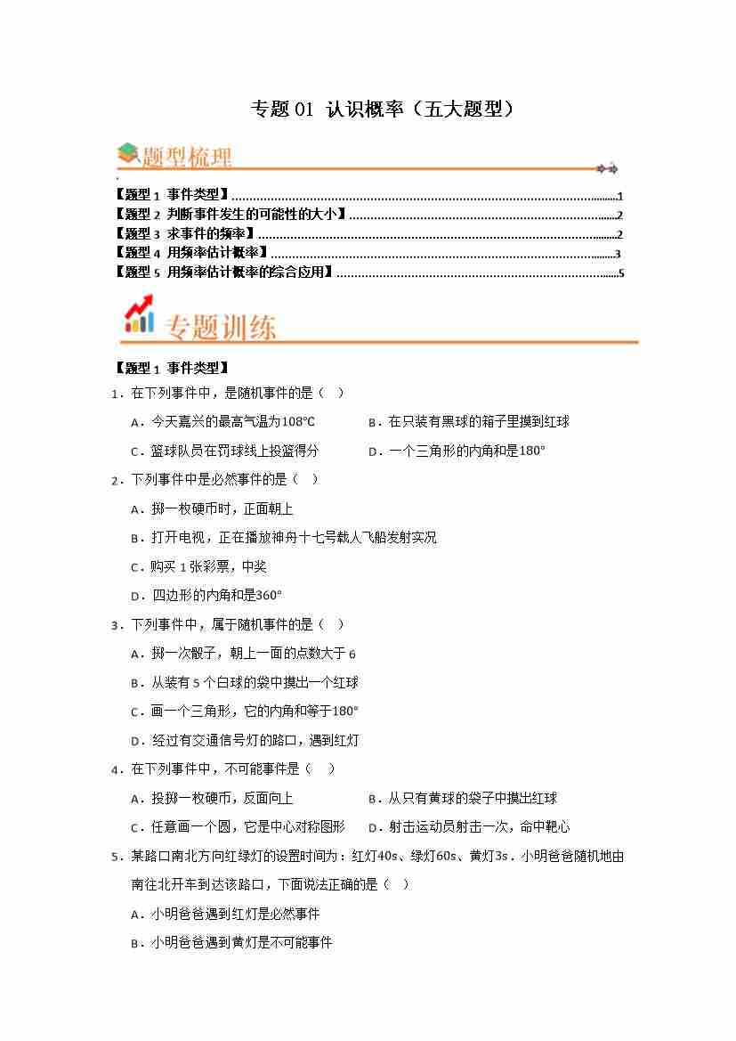 专题01 认识概率(五大题型)(题型训练易错精练)(原卷版)