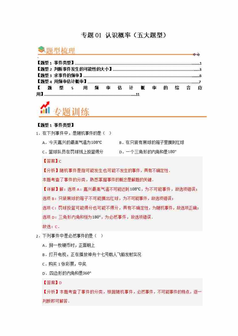 专题01 认识概率(五大题型)(题型训练易错精练)(解析版)