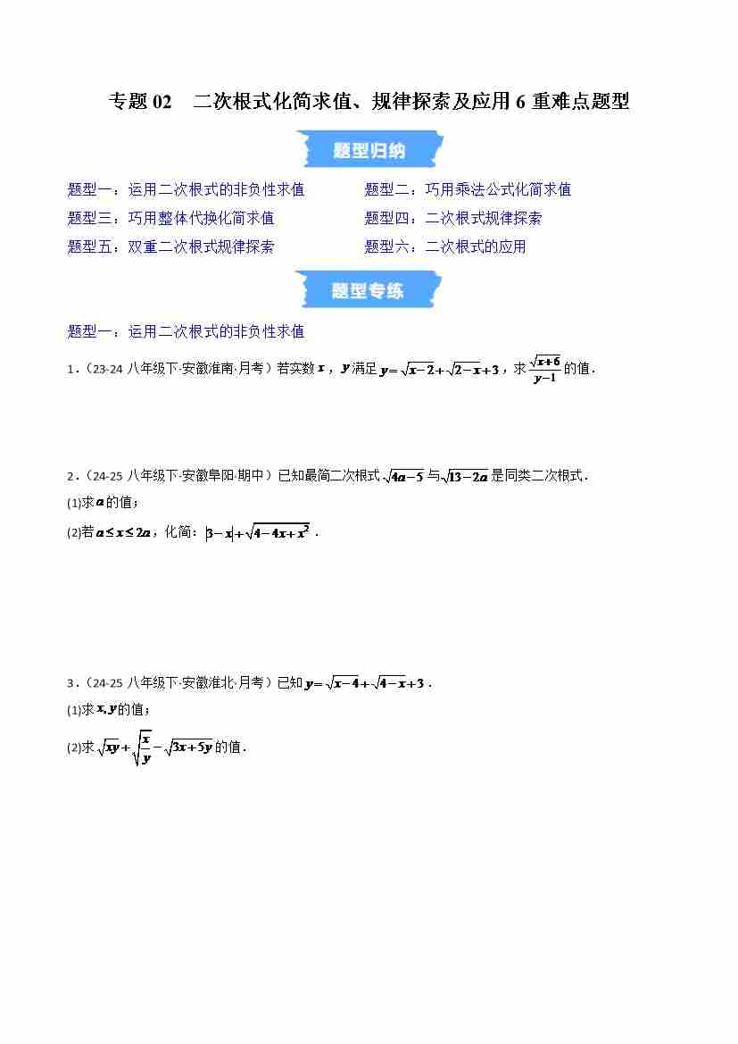 专题02 二次根式化简求值、规律探索及应用6重难点题型(高效培优专项训练)(原卷版)