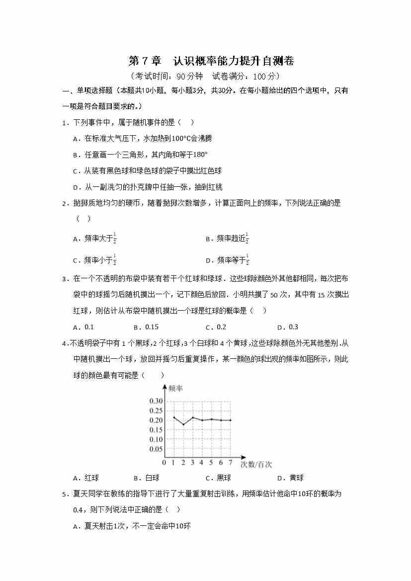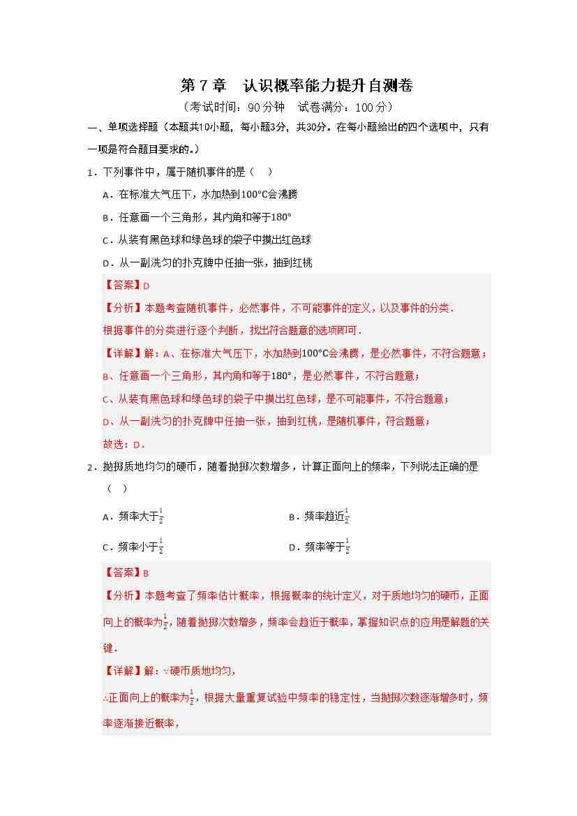 第7章 认识概率能力提升自测卷(解析版)