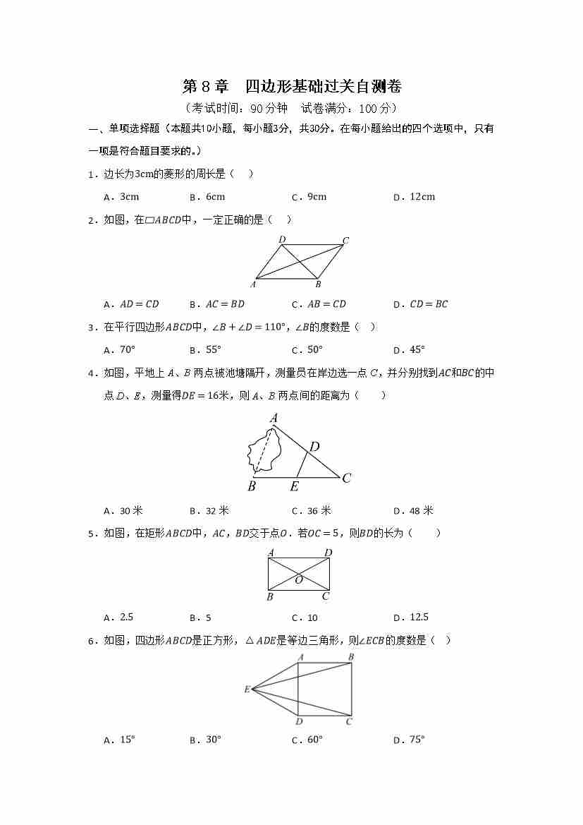 第8章 四边形基础过关自测卷(考试版)